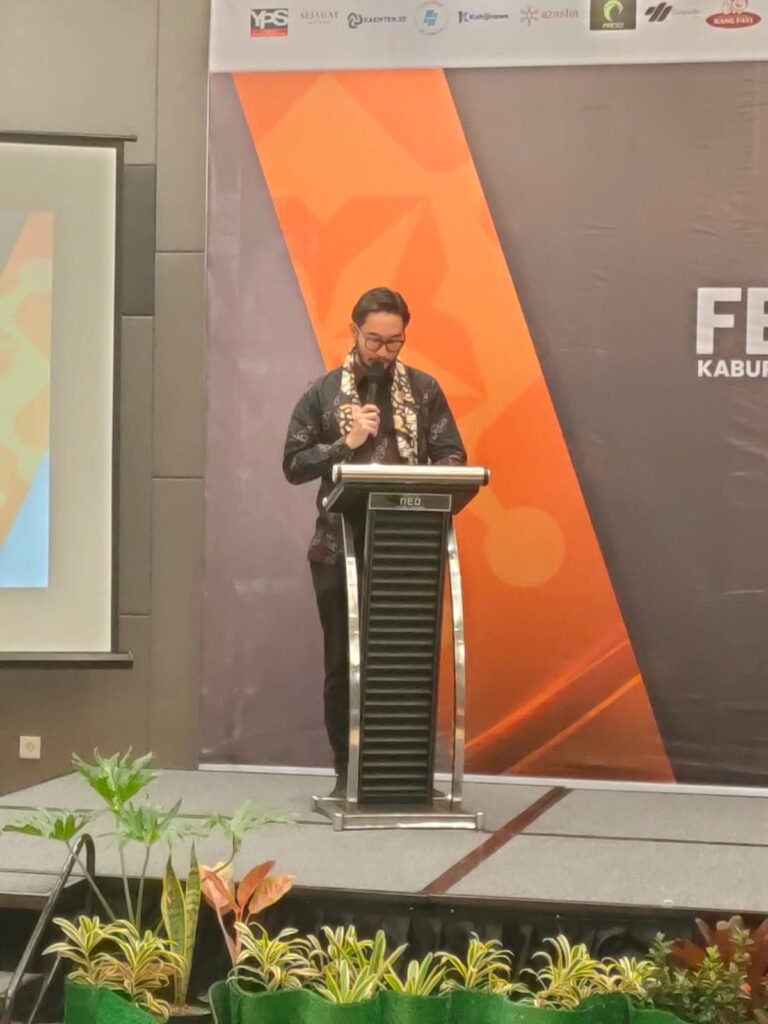 Adi memaparkan dua program unggulan FEKRAF, yakni JABOS (Jaringan Aktivis Digital Bisnis Optimis Sukses) yang menyasar pelajar SMA melalui pelatihan konten kreator dan wirausaha muda, serta program akselerasi ekonomi kreatif bagi pelaku UMKM dan subsektor ekraf melalui kurasi produk, peningkatan kualitas, dan penguatan akses pasar.